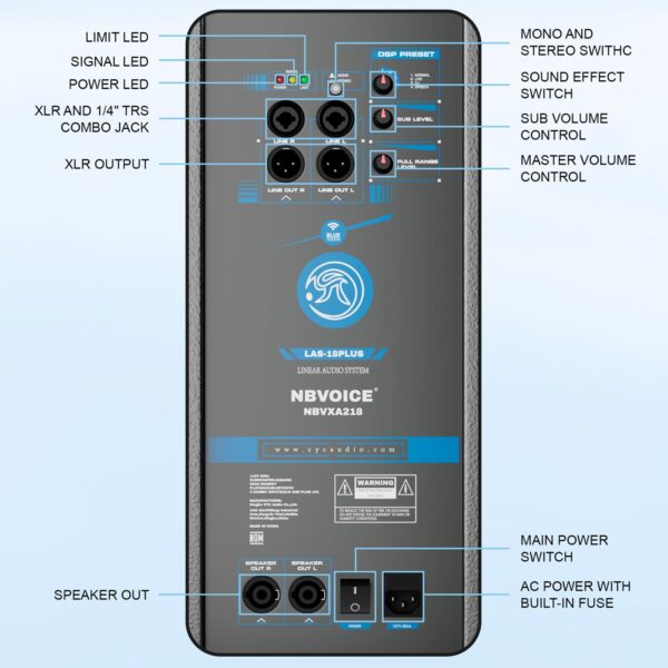 - Versatile Connectivity Options: The system includes 3 line inputs (RCA, 3.5mm AUX, and 6.35mm/XLR combo), 2 mic inputs, and 2 XLR outputs. Ideal for connecting microphones, instruments, or additional speakers for larger setups.