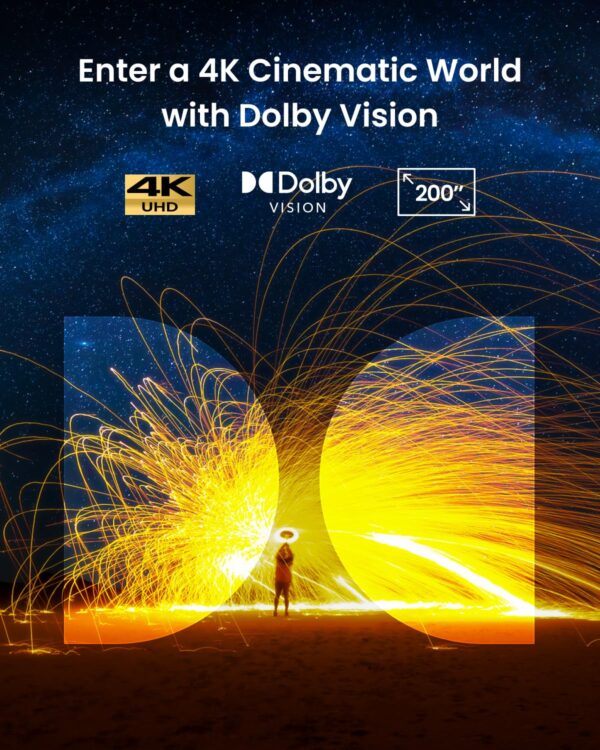 - 4K Dolby Vision, Huge 200″ Screen: Enjoy stunning 4K visuals, 40× higher brightness, 50× better contrast, and true-to-life colors with Dolby Vision. Features a 200″ max screen size for a truly cinematic experience.