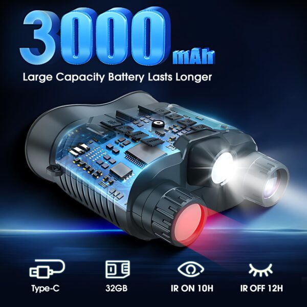 - Long-Lasting Rechargeable Battery – This 4k night vision goggle comes with a 3000mAh rechargeable battery that lasts up to 10 hours in IR mode and 12 hours on normal settings – perfect for long nights in the field without frequent recharging. With IP54 rated waterproof design, the night vision can be used even when facing extreme weather and complex terrain, even in light fog or rain
