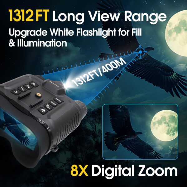 - 8x Digital Zoom &1312FT View Range – With 8x digital Zoom and 10x optical zoom, observation range of this head-mounted night vision device extends up to 1312 feet (400 meters). We’ve equipped it with a starlight-rated sensor that provides exceptional clarity even in low-light conditions, ensuring you won’t miss a moment