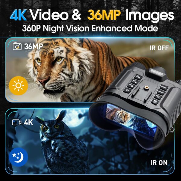 - 4K Ultimate Clear Visual Experience – Night vision goggles are capable of taking exceptional 36 MP photos and support 4K Full HD video recording. The thermal binoculars device is equipped with a 2.7-inch HD display + 6.5x viewing window, TFT HD screen can achieve 17.5-inch large screen visual viewing experience on the night vision goggles. 4 screen color modes: glow-in-dark green, infrared, B&W, full-color to meet your different needs