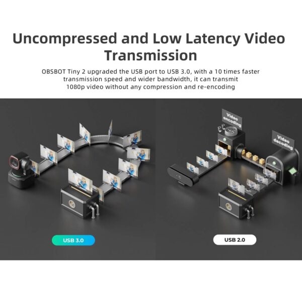 - 🏆【Uncompressed and Low Latency Video Transmission】OBSBOT Tiny 2 upgraded the USB port to USB 3.0, with a ten times faster transmission speed and broader bandwidth, it can transmit 1080p video without any compression and re-encoding.
