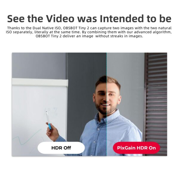 - 🏆【PixGain HDR】Thanks to the Dual Native ISO, OBSBOT Tiny 2 can capture two images with the two native ISOs separately, literally at the same time. By combining them with our advanced algorithm, OBSBOT Tiny 2 delivers images without motion blur.