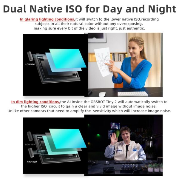 - 🏆【Dual Native ISO for Day and Night】Combining two native ISOs in one CMOS, OBSBOT Tiny 2 can automatically switch to the proper ISO in different lighting situations, achieving exceptional imaging in both dim and glaring lighting conditions.
