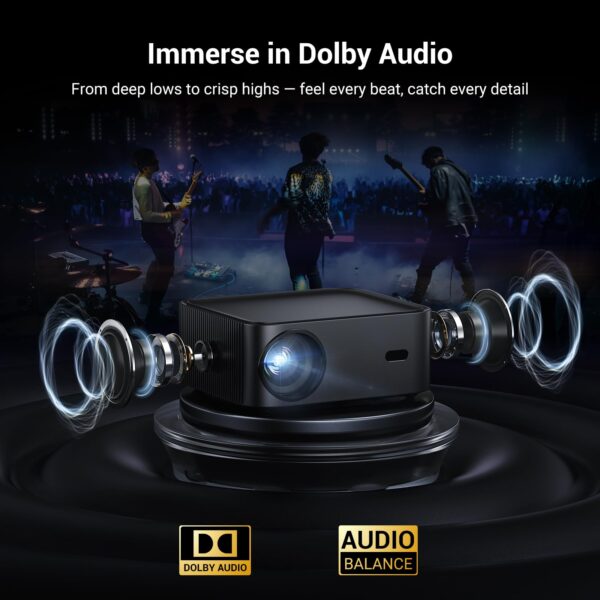- [Dolby Audio Built-in Speaker]-HAPPRUN mini projector features Dolby-certified Hi-Fi stereo dual speakers. Its specially designed sound diaphragm delivers powerful bass and crisp audio details—far beyond typical home projector sound quality.