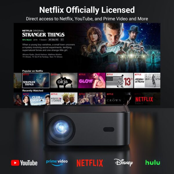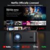 - [Netflix Officially Licensed – No Extra Devices Needed]-Transform any space into a theater with this advanced 4K projector. It offers direct streaming access to Netflix, Prime Video, YouTube, and over 10,000 other videos. Enjoy the convenience of watching your favorite shows and movies without the need for an additional TV stick.