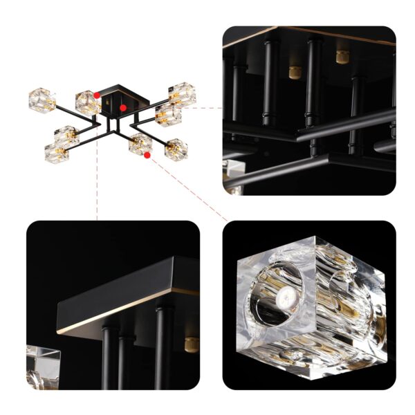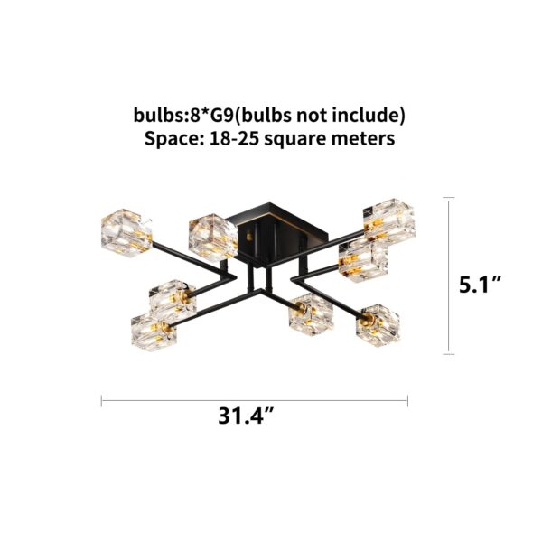 - 【K9 Crystal Material】The 8 lampshades of the ceiling light are made of clear K9 crystal, the lamp body is made of high-quality polished brass, the cube crystal lampshade is matched with G9 bulbs (bulbs are not included), and the crystal chandeliers reflects the bright light effect and projects it to the ceiling, making your home Reveals a low-key and elegant atmosphere