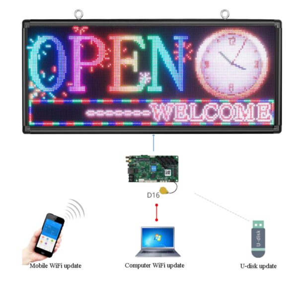 - 2. EASY & EFFICIENT UPDATES:** Equipped with built-in Wi-Fi and a user-friendly app compatible with Windows (Win8/Win10/Win11), this LED sign allows for hassle-free message updates via your smartphone or laptop. The flexible programming ensures you’re always one step ahead with the latest promotions. (Not compatible with Mac OS).