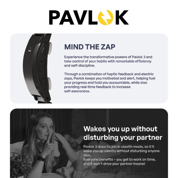 - ⚡PAVLOK 3 for WAKING UP! Waking up has never been so easy. Choose between three stimuli to get you out of bed (chime / vibration / zap) and you’re guaranteed to wake up, get up, and stay up! No more snoozing!