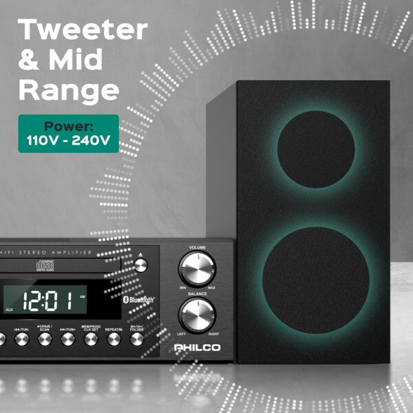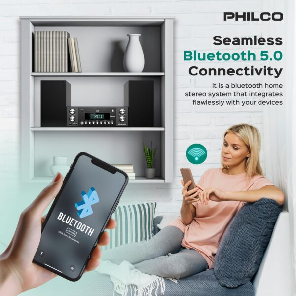 - Complete Package: Included in the box are a remote control, a power cord, and instructions for use. With the Philco Executive Shelf System, you get a home stereo system with Bluetooth and various connectivity options, including a 3.5mm Aux input, a headphone jack, and speaker terminal blocks, making it the perfect bluetooth stereo system for home.