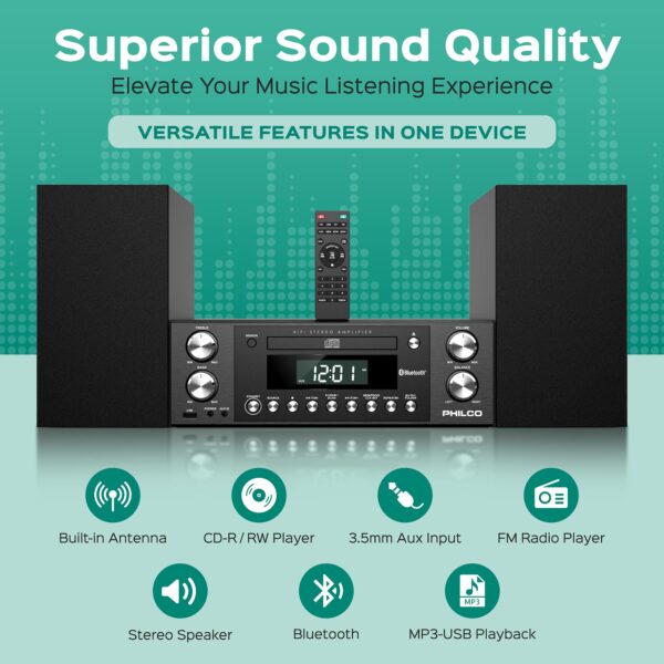 - Superior Sound Quality: The Philco Executive Shelf System is a premium stereo system for home, offering a 50 Watts (2×25 watts) 3-Way speaker system. This cd stereo system with speakers is sure to elevate your music listening experience, making it an essential component of stereos for your house.