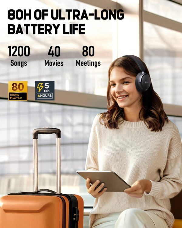 - 【80H Battery Life & Fast Charging】With ANC off, these headphones offer up to 80 hours of playback. Just 5 minutes of charging gives you 6 hours of use. A full charge lets you listen to 1,200 songs, watch 40 movies, or attend 60 meetings. For extended use, switch to wired mode. Perfect for long trips. (Includes Type-C charging cable and 3.5mm audio cable.)