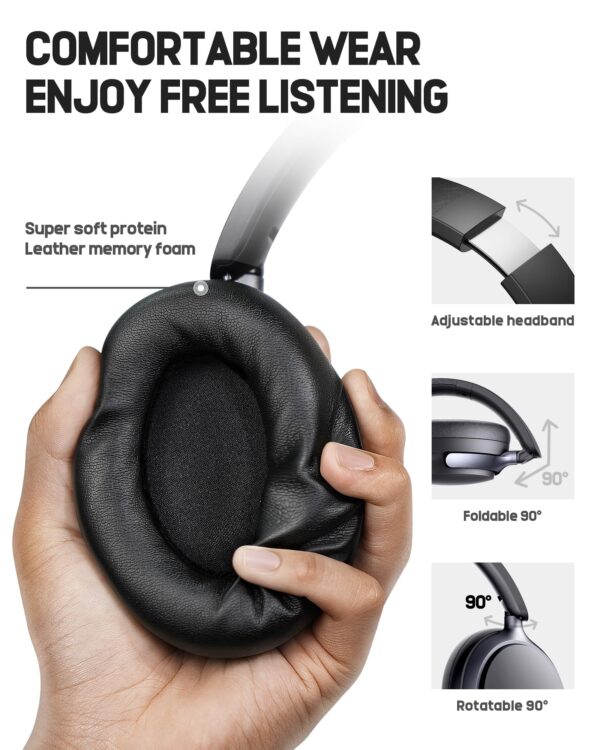 - 【Ultra Comfort & Adjustable Design】The noise cancelling headphones feature ultra-soft protein leather ear cups for exceptional comfort. Their adjustable design ensures a perfect fit and ergonomic support, preventing discomfort even during extended wear. Lightweight and foldable, they’re easy to carry, making them ideal for work, commuting, or travel—offering a seamless audio experience wherever you go.