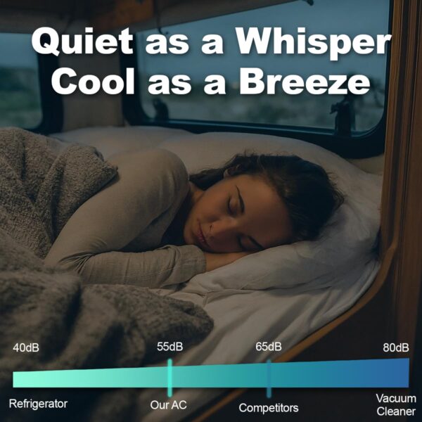 - ✅ Ultra-Quiet Operation – Just 55.4 dB – Say goodbye to loud, disruptive units! With a noise level similar to a gentle rain, this whisper-quiet air conditioner lets you sleep, relax, or work inside your RV without the hum of traditional AC systems.