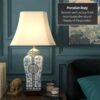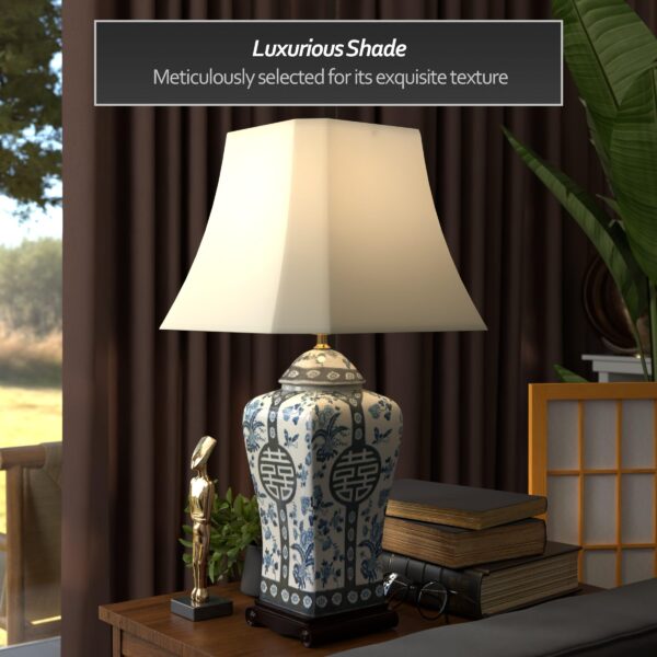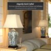Details: Elegantly hand-crafted by artisans in China’s Guangdong province, this beautiful piece combines a Song dynasty style porcelain vase with a carved wooden base. The porcelain part of the lamp features a textured glaze sure to add a colorful accent to any room. A fabric shade on a steel frame completes the design. This porcelain lamp features a three-way light fixture that uses up to a 100 watt bulb and includes a soft hand made shade.