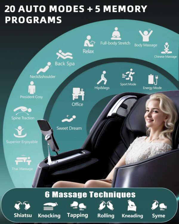- 【Multiple Levels Adjustable】:Elevate your comfort with five levels of customizable stretching and massage speeds. The zero gravity chair has 20 built-in automatic massage programs. At the same time, you can adjust the stretching degree of the massage chair recliner and adjust its massage speed and strength according to your own needs.