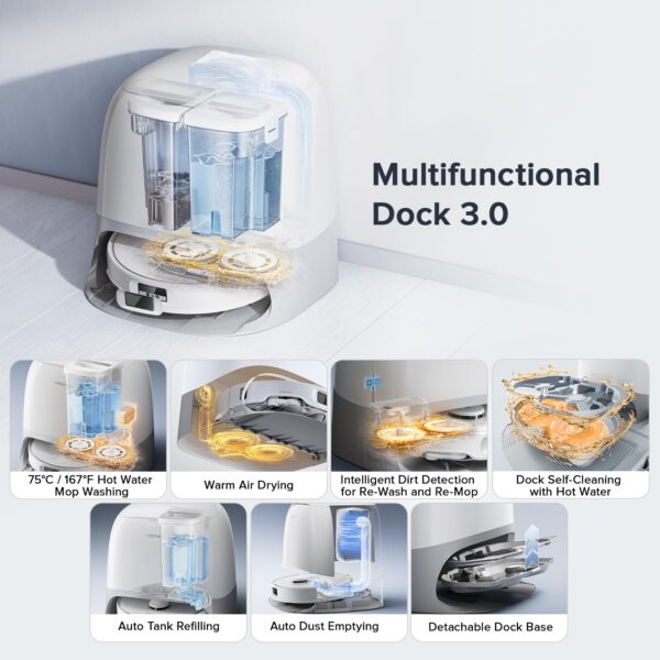 - Multifunctional Dock 3.0: The dock provides 167°F (75°C) hot water mop washing, cleaning stubborn stains and greasy messes from mops without trouble. Dock self-cleaning with hot water and the warm air drying feature ensure your mop and floors stay fresh and well-maintained. The intelligent dirt detection system ensures mops are thoroughly cleaned and floors re-mopped as needed. Enjoy auto dust emptying for up to 7 weeks, auto tank refilling, and a detachable base for added convenience