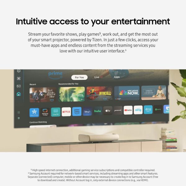 - SAMSUNG TIZEN OS: Stream your favorite shows, play games⁵, workout, and get the most out of your smart projector, powered by Tizen; In just a few clicks, access your must-have apps and endless content from the streaming services you love⁶