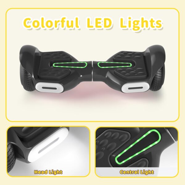 - LED Lights: SIMATE Hoover board, built-in Bluetooth music speaker. A unique design, the hoverboard has LED head lights and central lights, letting your kids enjoy a safer and more fun ride
