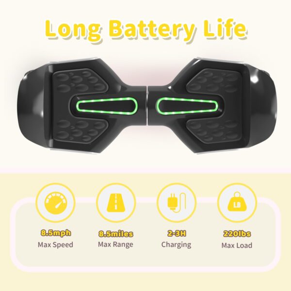 - Long Battery Life: SIMATE Hoverboard, 6.5″ solid rubber wheels, Aluminum frame, non-slip footpad. Top speed of 7.5 mph(3 adjustable speed modes) and top range of 7.5 miles by two powerful 250W dual motors, max load of 220 lbs. 15-degree slope