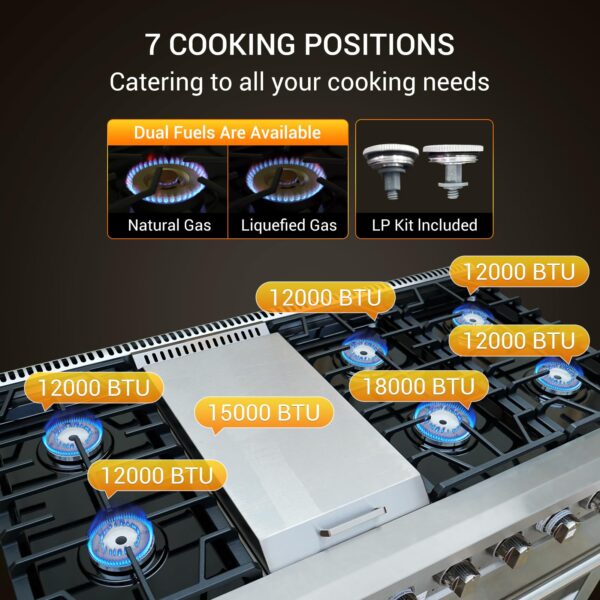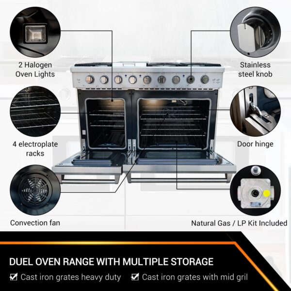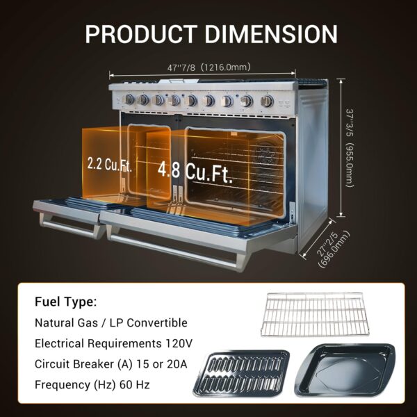 - FREESTANDING GAS RANGE: This 48-inch gas range and oven all-in-one multifunctional appliance saves space while allowing you to show off your cooking skills.