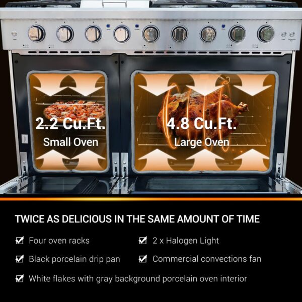 - DOUBLE OVEN: Our freestanding gas range comes with two ovens. The capacity is 4.8 cu.ft oven capacity and 2.2 cu.ft oven capacity respectively. both ovens have independent burners, which can satisfy your needs at the same time.