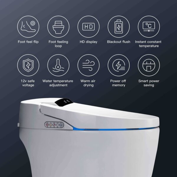 - 【INTELLIGENT CONTROL TOILET】Off-seat flushing, button control flushing, foot sensing flushing, and remote control flushing will flush to make you free your hands in all directions. And we set the KEY KNOB function button for the elderly and children. They can quickly switch between rinse, clean and dry functions. The smart toilet LCD displays a real-time display of toilet function usage.