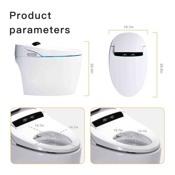 - 【PRODUCT SPECIFICATIONS】QPE one-piece smart toilet product size: 26.8in*16.1in*20.9in. Net weight: 88.3lb. Material: Ceramics. Voltage: 110V-130V. Power cord length: 60 inches.