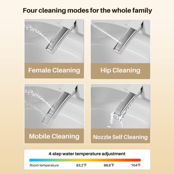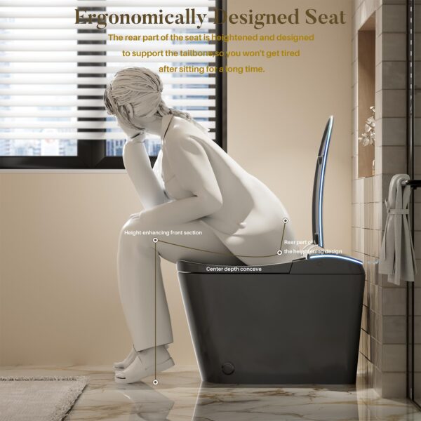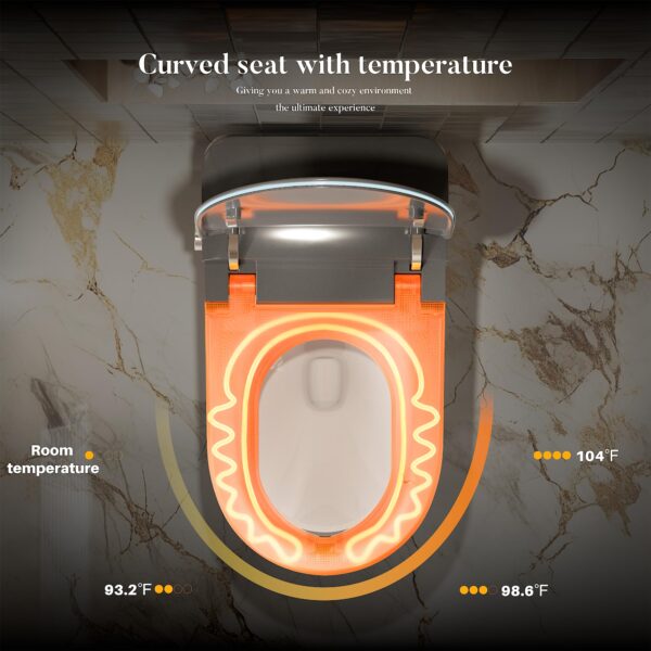 - SMART TOILET WITH BIDET BUILT-IN: This inodoro inteligente is friendly to wome.Featuring a heated bidet toilet seat , warm air dryer, With 3-second instant heating technology and 4 adjustable temperature levels function, and soothing LED night light. Your bathroom will become a sanctuary of comfort and technology.