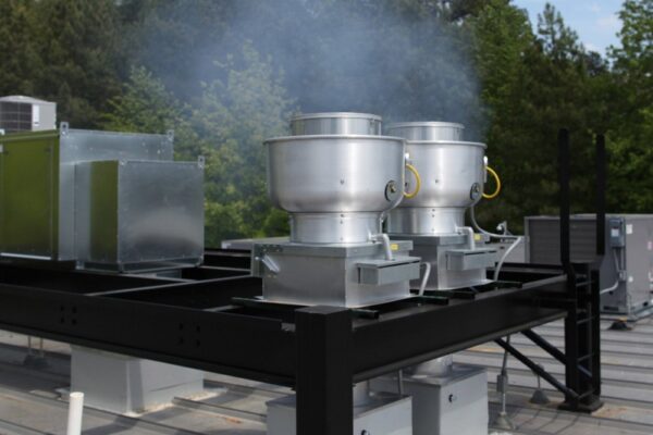 • Exhaust Fan Specifications- High Speed Direct Drive Centrifugal Upblast Exhaust Fan with speed control (single phase only), disconnect switch and 11-3/4″ wheel. Exhaust Fan handles 1350 CFM @ -0.750″ wc ESP, Fan runs at 1403 RPM. Exhaust Motor: 0.500 HP, 1 Phase 115 V, 60Hz, 8.1 FLA, ODP (Open Drip Proof). Includes grease box and hinge kit. Vented Roof Curb 19.5” square x 22” high