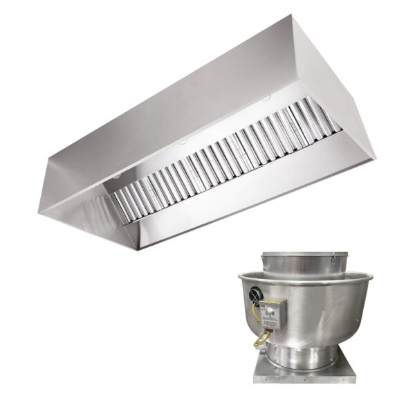 • ETL & NSF Stainless steel hood system, includes stainless steel exhaust only hood , rooftop direct drive exhaust fan, and flat roof curb.