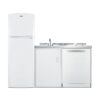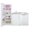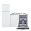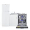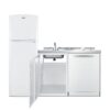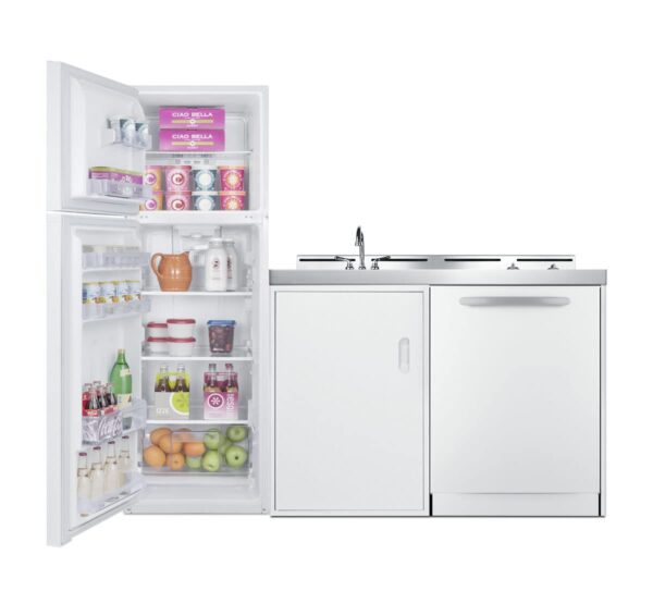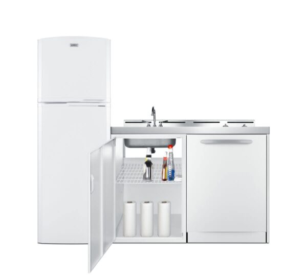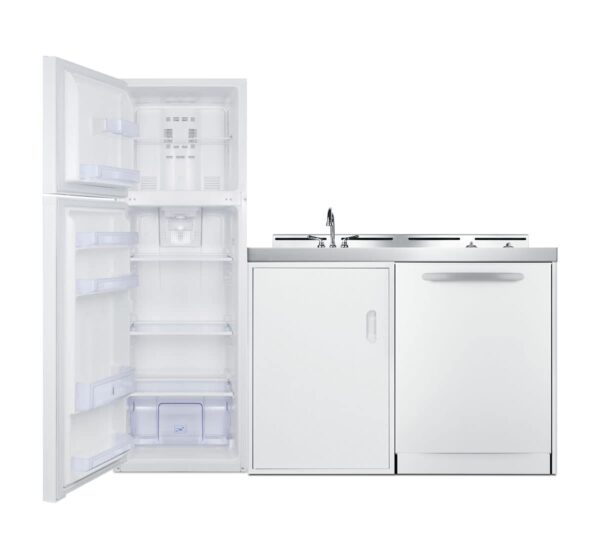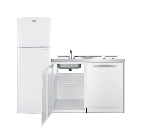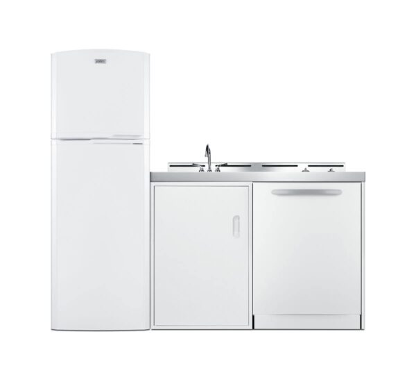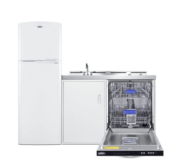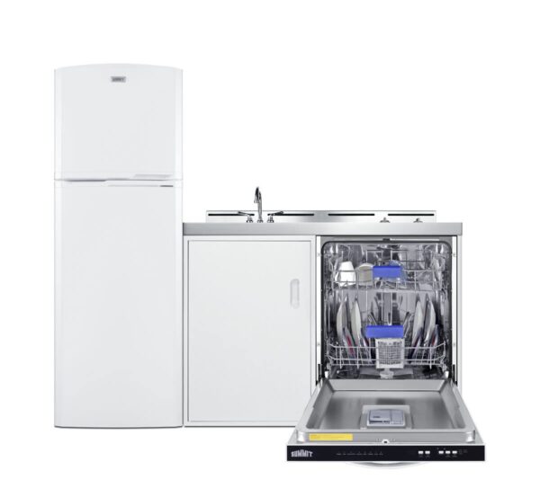 - Includes a full-sized refrigerator-freezer, 24″ dishwasher, 2-burner cooktop, sink with faucet, and storage cabinet