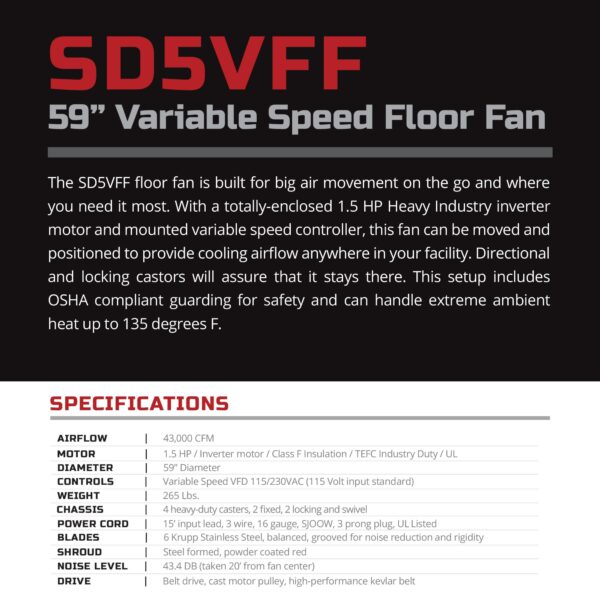 Details: The SD5VFF large industrial fan is built for big air movement on the go and where you need it most. With a totally enclosed 1.5 HP Heavy Industry inverter motor and mounted variable speed controller, this fan can be moved and positioned to provide cooling airflow anywhere in your facility. It’s effective as a warehouse, dock, shop, workstation or garage fan. Four directional and locking casters (the front 2 pivot for easier movement) assure this portable floor fan stays put. Choose between our Krupp Stainless Steel Blades, which throw a wide diffused air pattern up to 60′ wide, or our Red Composite Lineal Distance Blades which throw a high-velocity narrow & long air pattern up to 120′ long. The Red Lineal Blades are slightly louder due to a higher RPM setting.