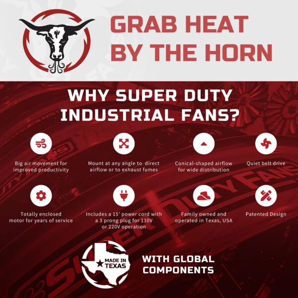 • Commercial Fan Built For Safety: Powder-coated and zinc-plated shrouded and guarded blades promote safety by protecting this heavy duty fan’s components. An enclosed motor keeps moisture and dust out. The SD5VFF 110V is red to help ensure a forklift operator or anyone else can’t miss it. Plus, it looks good.
