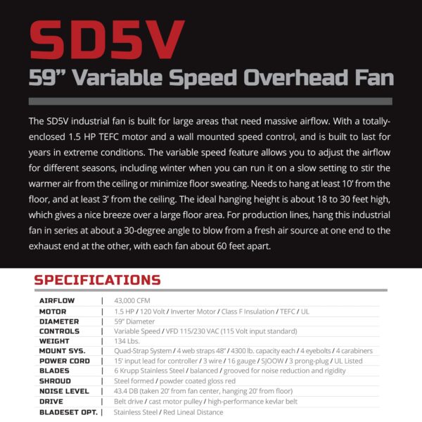 - Minimal Maintenance: The quiet and powerful belt drive system helps provide years of use and comfort with no maintenance besides periodic exterior dusting for at least 5 years. At that mark, your industrial cooling fan’s belt may need tightening. Besides that, your SD5VFF 110V takes care of itself while keeping you cool.