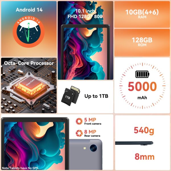 Tablet,10.1″ Android Tablet with Octa-core Processor 10GB RAM 128GB ROM HD IPS Touchscreen 8H Battery, Wi-Fi 6, BT 5.0, Dual Camera, Google Tablets 2025