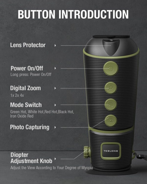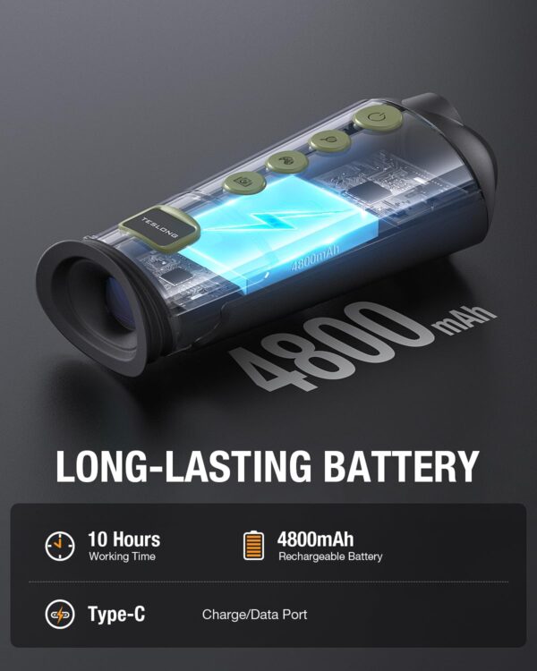 - [10 Hours Long-Lasting Large Battery Capacity] Teslong thermal monocular are powered by a built-in 4800mAh rechargeable battery that can last over 10 hours of continuous outdoor use (Please keep the device out of direct sunlight, extreme temperatures, and humid environments)