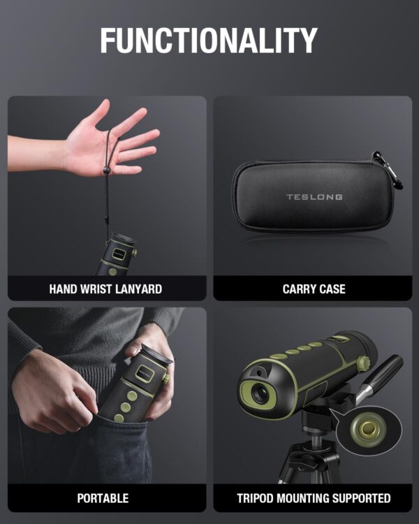 - [Portable Thermal Imaging Monocular] The Teslong thermal imaging monocular is compact, pocket-sized, and tripod-mountable. It includes a carrying case and hand wrist lanyard, making it easy to carry for hunting, law enforcement, search and rescue, hiking, and travel. If you have any questions about Teslong thermal imaging monocular, please feel free to contact us