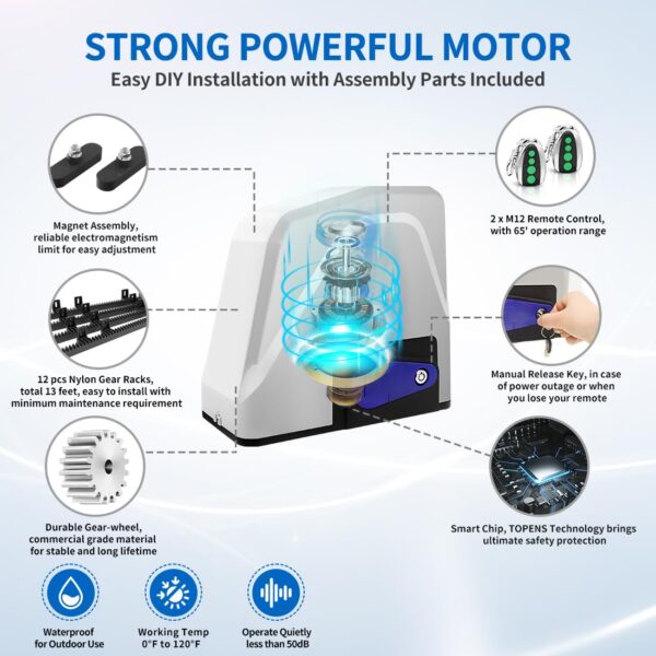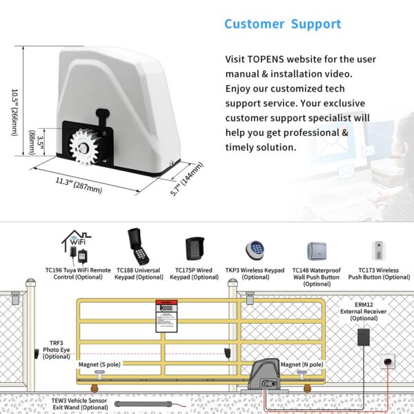 • Strong Gate Opener – TOPENS RK1100T automatic gate opener, equipped with a STRONG 3/5 HP 450W AC motor, effortlessly drives the heavy-duty slide gate up to max 2800lbs. in weight and max 40ft. in length. This ultra-quiet electric gate motor ensures convenient and comfortable gate operation, enhancing your family’s lifestyle.