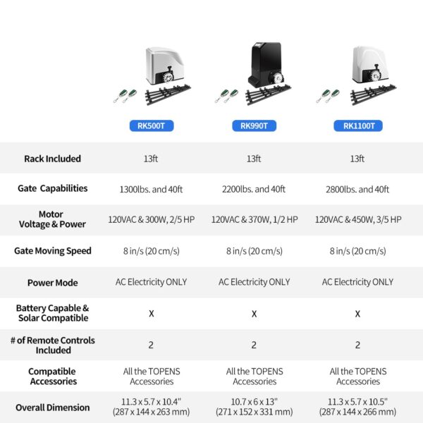 • Personalized Design – Equipped with a smart chip, effortlessly switch the open/close direction to accommodate your preferences. Your gate is allowed to open toward left or right. Reliable electromagnetism limit switch for simple adjustment. Note: RK1100T operates ONLY on 110-120VAC electricity. Your purchase includes 12 pcs nylon gear racks (13ft. in total). Enhance functionality with battery and solar power options – explore TOPENS DK1000(S), DKR/DKC series sliding gate openers.