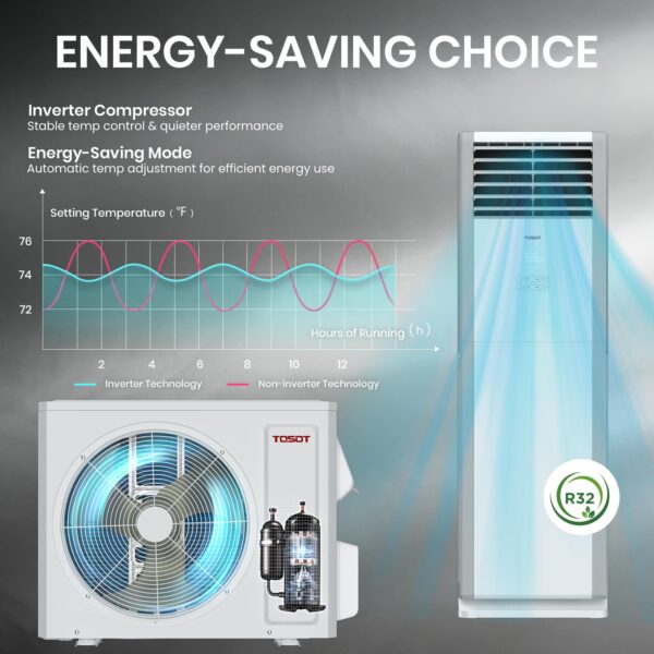 - Energy-Saving Use: Equipped with an inverter compressor and R32 refrigerant for optimized energy use; Energy-saving mode automatically adjusts cooling to maintain a comfortable temperature while reducing unnecessary power consumption