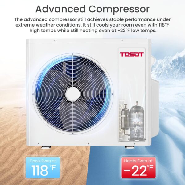 - Extreme Weather Resilience: Featuring an advanced compressor, the TOSOT multizone system operates in ambient temperatures from -22℉ to 118℉. It performs well year-round, whether you’re in hot states like Arizona or cold regions like Michigan. The intelligent defrost function enhances heating efficiency in colder environments.