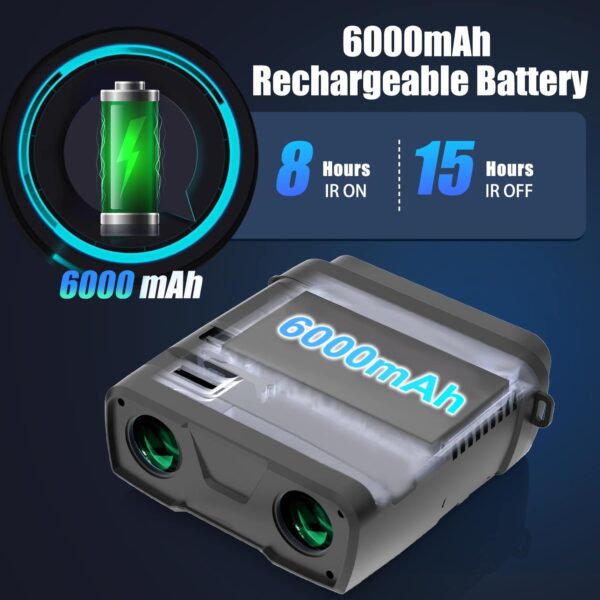 • What You Get ? Package include: 1 x 4K Full-Color Night Vision Binoculars, 1 x Carrying Case, 1 x Neck Strap, 1 x Card Reader, 1 x 64G CARD, 1 x USB Cable, 1 x User Manual, 1 x Cleaning Cloth. Built-in 6000mah rechargeable battery working time of up to 8 hours, which can be significantly prolonged by connecting with a high-capacity external power bank. (We provide excellent customer service, if you have any questions about this product, please contact us.)