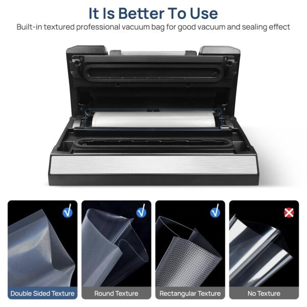 - 【11.8 Inch Built-in Cutter & Bag Storage 】- This food vacuum sealer machine has a complete starter kit with bag storage that can be easily adapted to any brand of vacuum sealer bags. Equipped with a bag cutter to accommodate custom bag linear cut sealing.