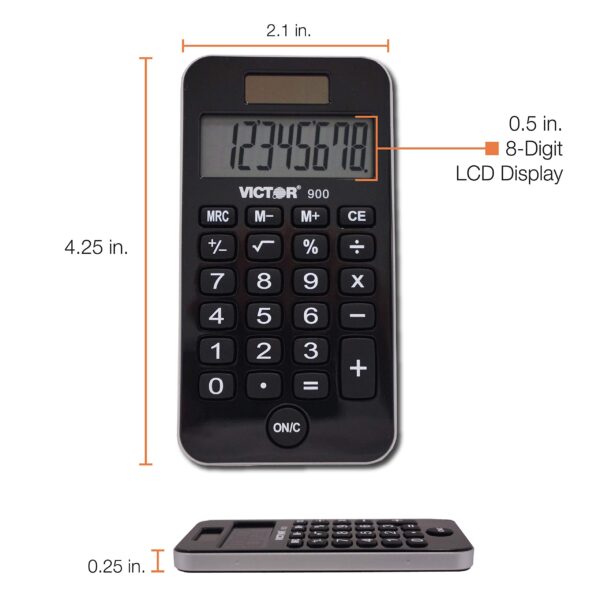 Details: The Victor 900 is perfect for school or on-the-go. The extra large 8 digit LCD display with 14mm display digits is easy to read. Comparable to the TI-108, and an educational kit is available with free teaching material. Contains 60 calculators.