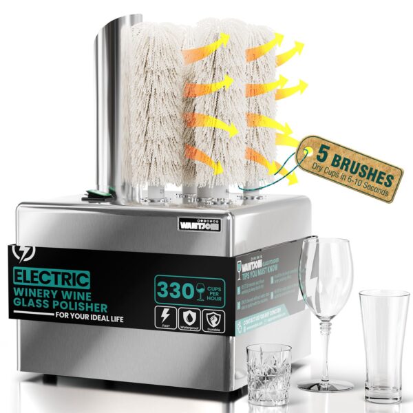 WantJoin Wine Glass Polisher Machine – 5 Brushes 330 Cups/Hour Commercial Electric Automatic Dryer with 304 Stainless Steel, 100% Cotton, 1300W High Power, 136°F Air Drying for Bar Restaurant Kitchen