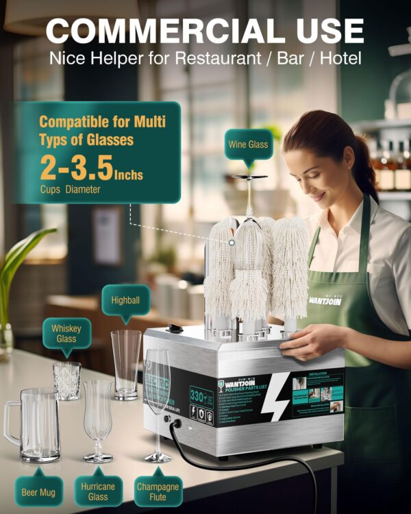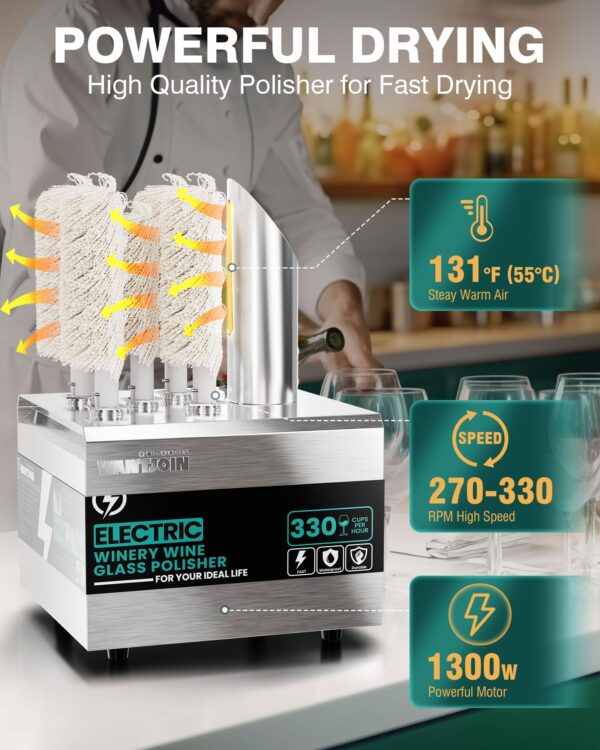- 330 CUPS PER HOUR HIGH EFFIENCY: Fast drying every glass cup in 6-10 seconds, WantJoin commercial wine glass polisher machine can polish up to up to 330 cups within an hour. Our glass polisher machine saves three quarters of the time compared to hand polishing.