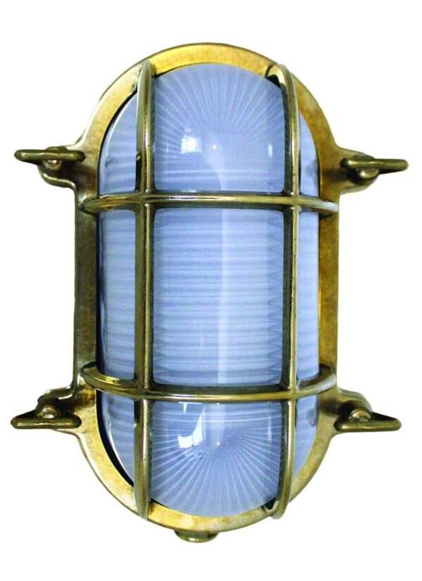 Details: The Oval Brass Bulkhead Light is made by Foresti and Suardi in Italy. This versatile light fixture is rugged enough for exterior used, but rich looking enough for the main salon. The frosted glass lens of the oval brass bulkhead light is protected by a brass framework and is mounted with two screws either to the bulkhead or overhead. Household installation will require drilling holes in the case. Unit has waterproof design for marine bulkhead use; meaning it is not intended to be wired from the back but rather from the bottom using conduit. Professional installation is strongly advised.
