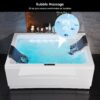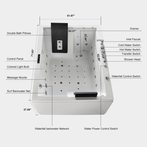 - Two Person Jetted Bathtub: With exterior dimensions of 71.65″L x 51.97″W x 27.56″H, and interior dimensions of 62.99″L x 43.31″W x 22.44″H, this bathtub offers ample space for up to two bathers to enjoy a relaxing and comfortable experience. Product Weight 238 Lb.