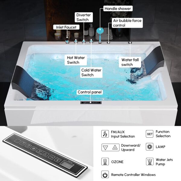 - Whirlpool and Bubble Massage Tub: Equipped with 18 powerful whirlpool water jets powered by a water pump, and 20 air jets powered by an air blower, this bathtub provides a vibrant massage and releases comfortable air bubbles, promoting relaxation and rejuvenation.